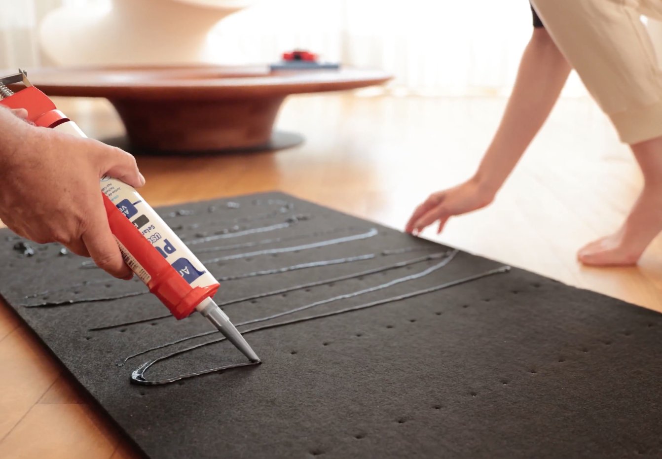 - Klebstoff: Tragen Sie Montagekleber in Form eines „S“ oder vertikaler Streifen auf die Rückseite des Filzes auf.